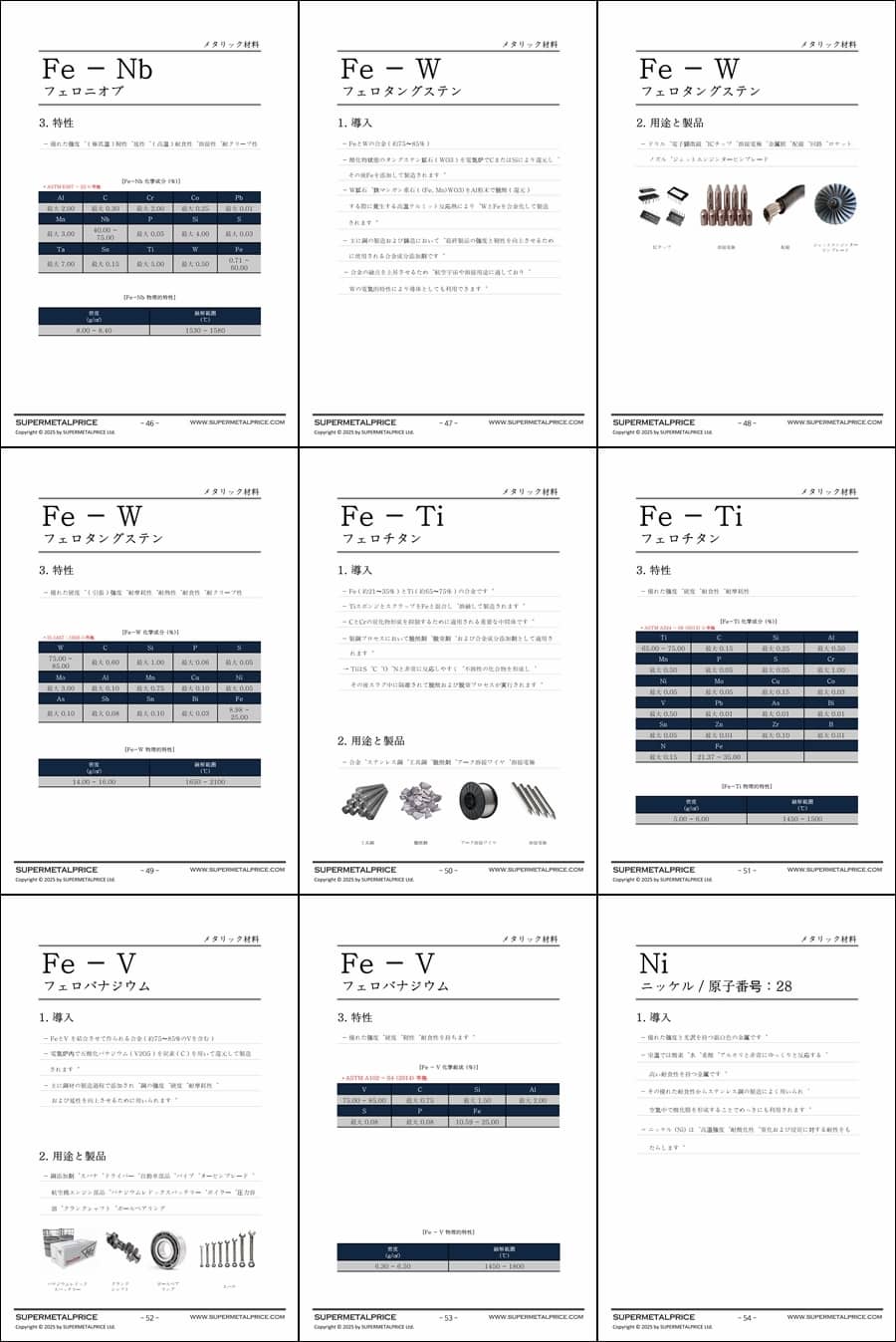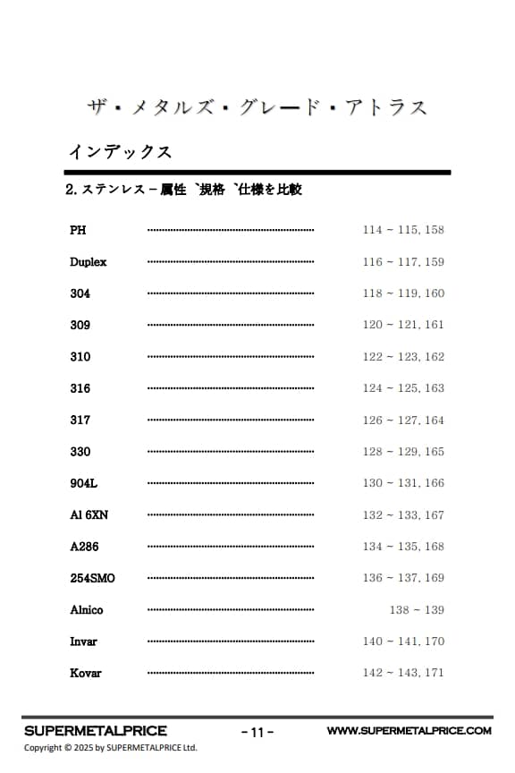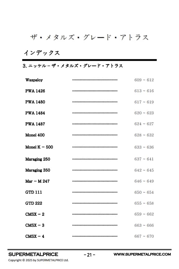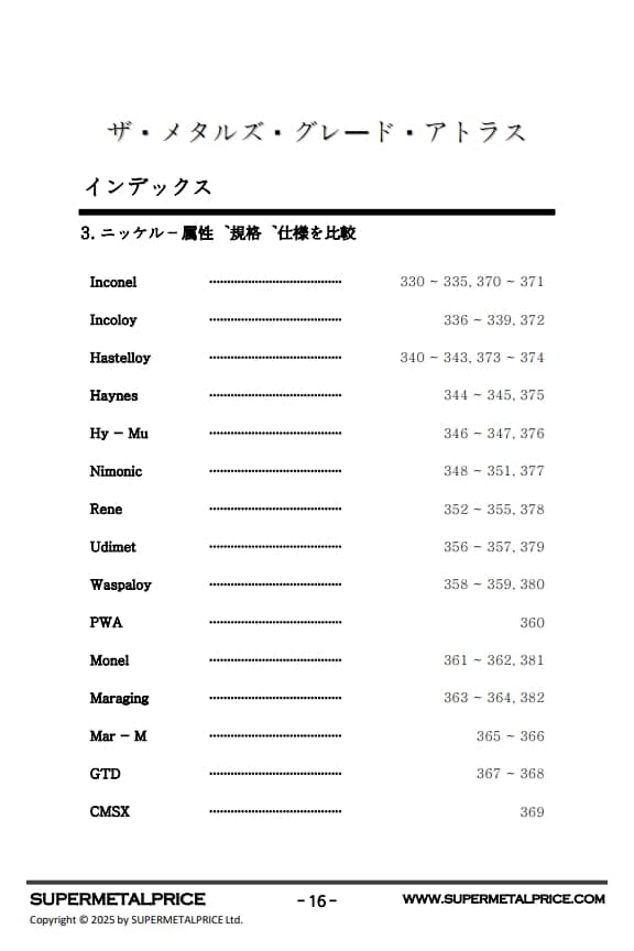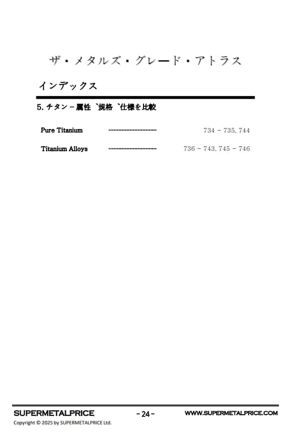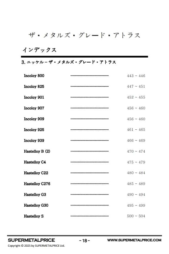 『メタルグレードアトラス』はこうした産業ニーズに応えるべく、チタン、ニッケル、鉄合金系を網羅した体系的な高性能金属材料ガイドを提供します。本書では、化学組成、機械的性質、耐食性、高温挙動、疲労強度、溶接性といった基本データに加え、実際の用途、材料選定基準、コストパフォーマンスまで幅広く解説しています。