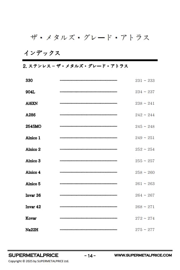 軽量かつ耐食性に優れ、航空宇宙分野の革新を支えるチタン合金から、1200℃を超える環境で比類なき耐熱性を発揮するニッケル基超合金、さらに造船・建設・自動車・エネルギー産業を支える特殊鉄合金まで――本アトラスは各材料グレードの特性と最適用途を明確に示します。これにより設計技術者、材料科学者、品質管理の専門家は、性能に基づいた正確で経済的な材料選定が可能となります。